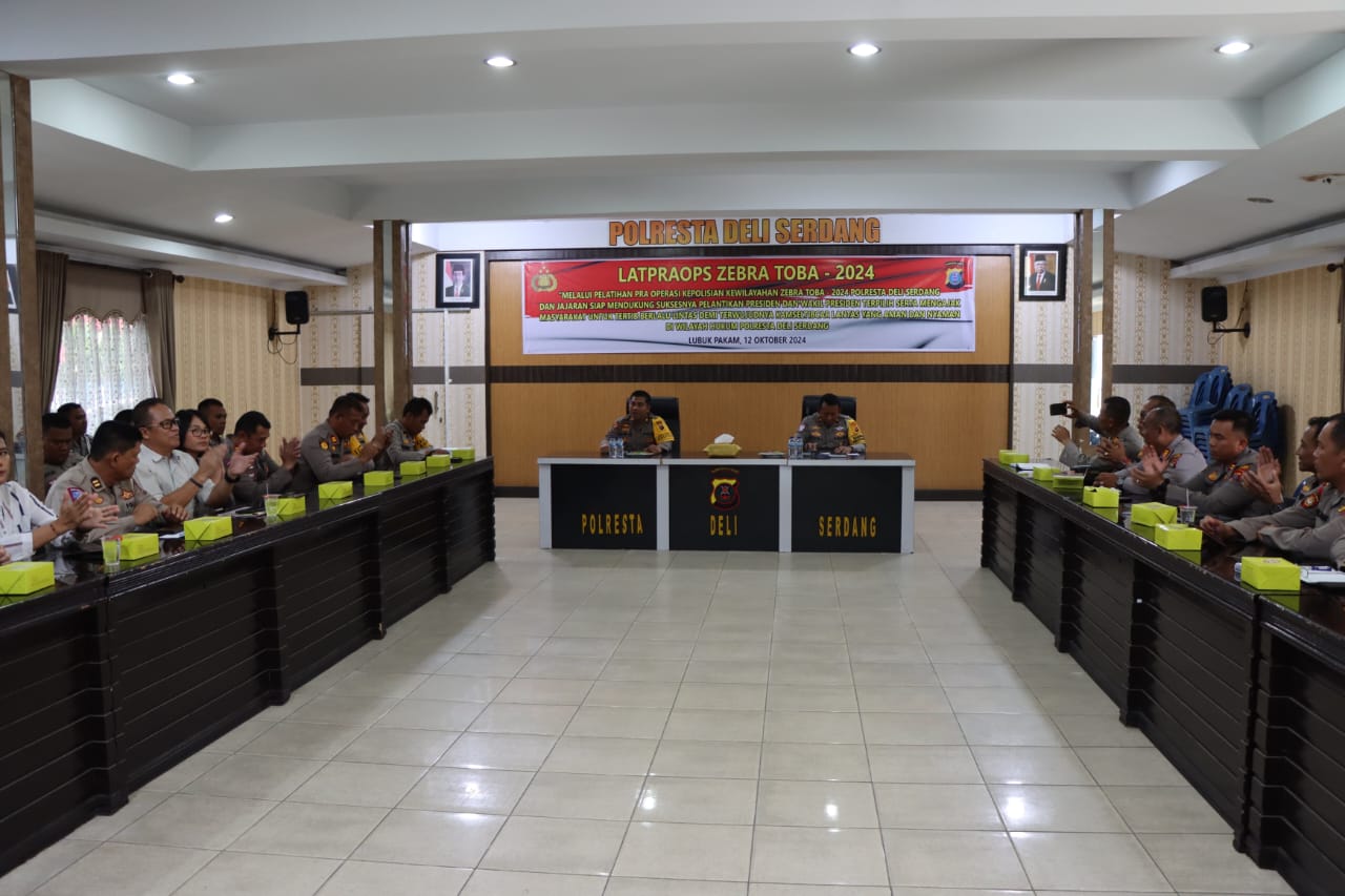 IDEL NEWS, DELISERDANG – Polresta Deli Serdang melaksanakan kegiatan latihan pra operasi kepolisian kewilayahan dengan sandi Zebra Toba 2024 dalam rangka mendukung suksesnya pelantikan Presiden/ Wakil Presiden serta Pilkada Serentak Tahun 2024, di Aula Tribrata Polresta Deli Serdang.